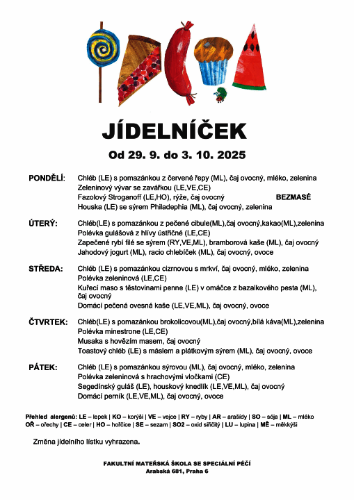 Provoz žluté, modré a červené třídy bude v tento den zkrácen do 13:30, abyste stihli první bod festivalového programu, kterým bude hudební workshop s Malou Muzičkou. Děti, které si nemohou rodiče vyzvednout po obědě, budou od 13:30 sloučeny v zelené třídě. Jedná se o mimořádnou situaci, kdy se spojí děti ze všech velkých tříd, a proto nemůžeme zaručit dětem kvalitu odpočinku v takové míře, jako při běžném provozu, pokud můžete, bude lepší děti vyzvednout po obědě. Děti bude možné si vyzvednout ze zelené třídy kdykoliv mezi 14:00 a 16:00. Prosíme, vyzvedněte si své děti nejpozději v 16:00.